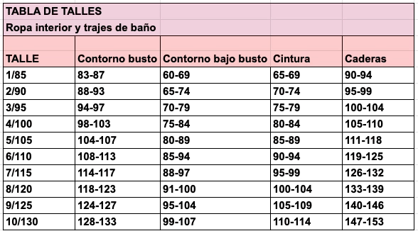 Revisa la tabla que se encuentra por debajo de este texto o en la segunda imagen para mayor legibilidad. Si estas entre dos talles, elegí el más chico ya que este corpiño tiene talles bien cumplidos.