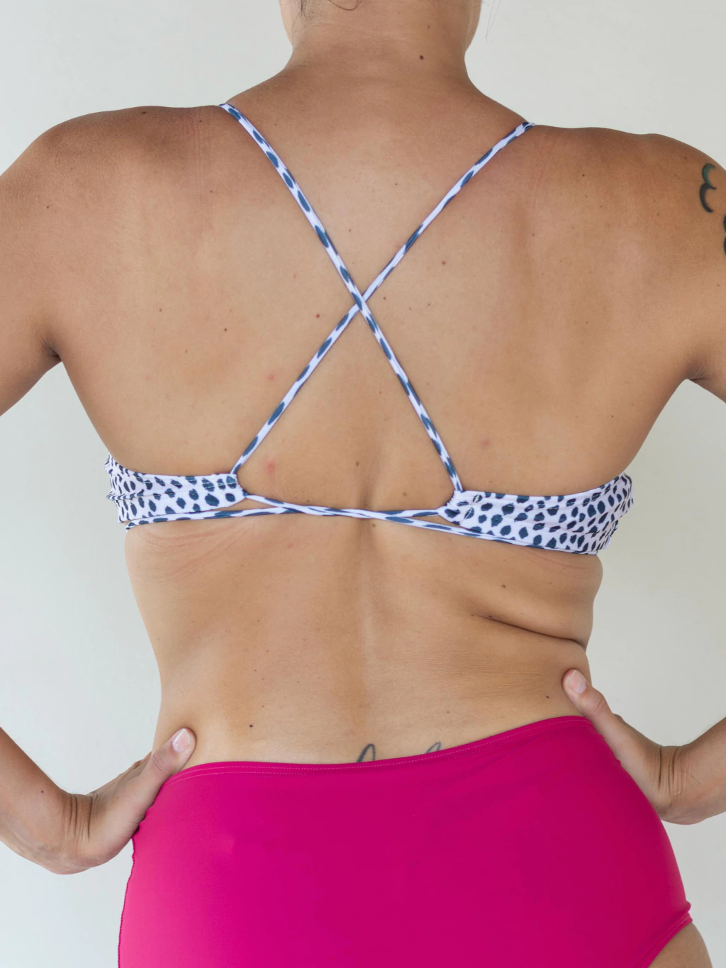 Top de bikini confeccionado en tricot de lycra con estampado animal print. Diseño moderno con recorte central en el frente que realza el busto y aporta un toque original. Cuenta con breteles finos regulables en la espalda para un calce cómodo y personalizado. Completamente forrado